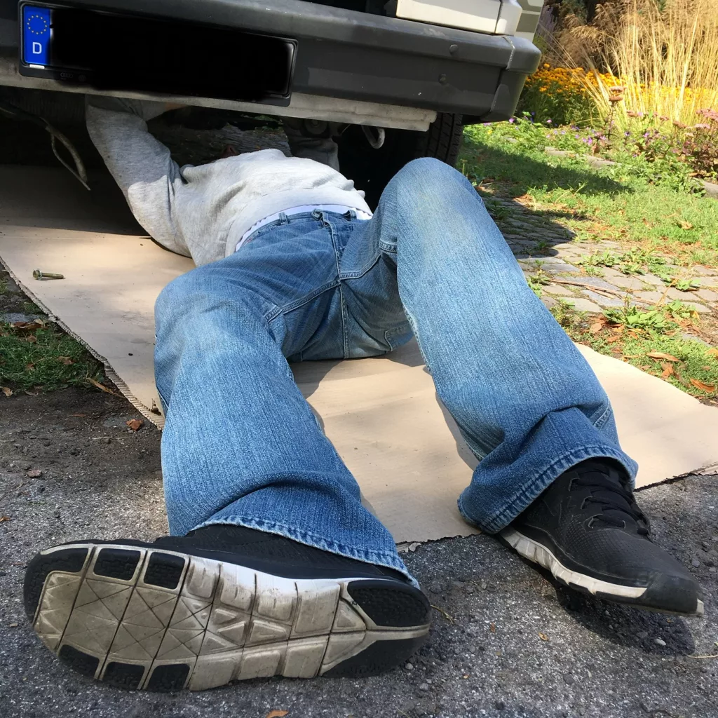 Dann der Anlasser: Der Wagen sprang manchmal nicht an, und das auf eine Art, die uns jedes Mal zittern ließ – ein leises Surren, dann nichts. Laut Vorbesitzer war das Teil bereits erneuert worden. Doch bei näherem Hinsehen fiel auf: Der verbaute Anlasser hatte zu viele Zähne. Das sorgte dafür, dass das Ritzel nicht zuverlässig ins Schwungrad griff. Der Startvorgang funktionierte manchmal, oft aber eben nicht. Also das alte Teil raus, ein passgenaues Ersatzteil organisiert, diesmal mit der exakt passenden Zahnzahl und Einbautiefe. Den Einbau übernahmen wir selbst – mit Unterstützung eines Schrauberfreundes aus der Nachbarschaft. Nach dem Austausch startete Momo wie ein Uhrwerk. Ein schönes Gefühl, den Motor nach der Reparatur wieder sauber anspringen zu hören.