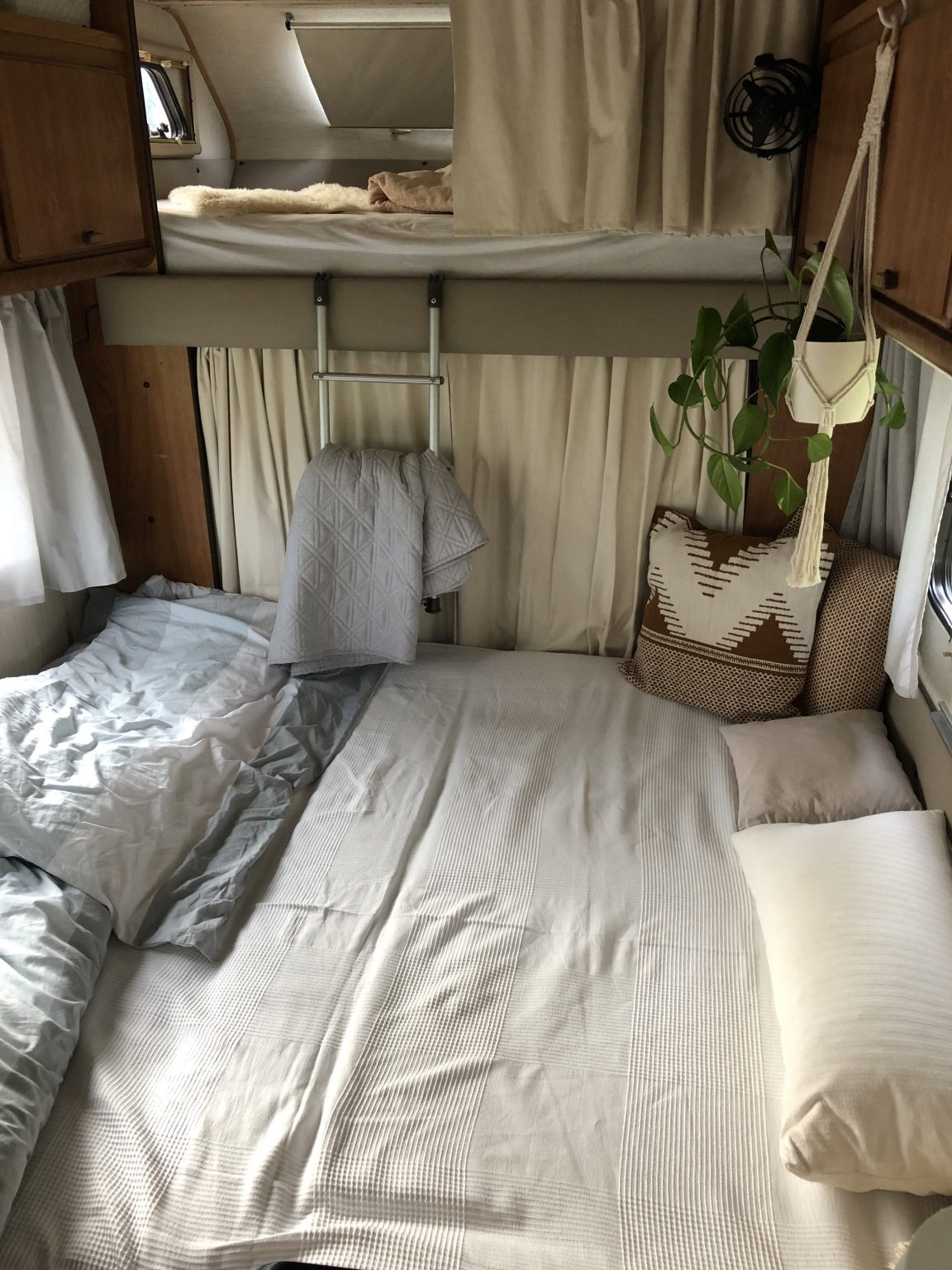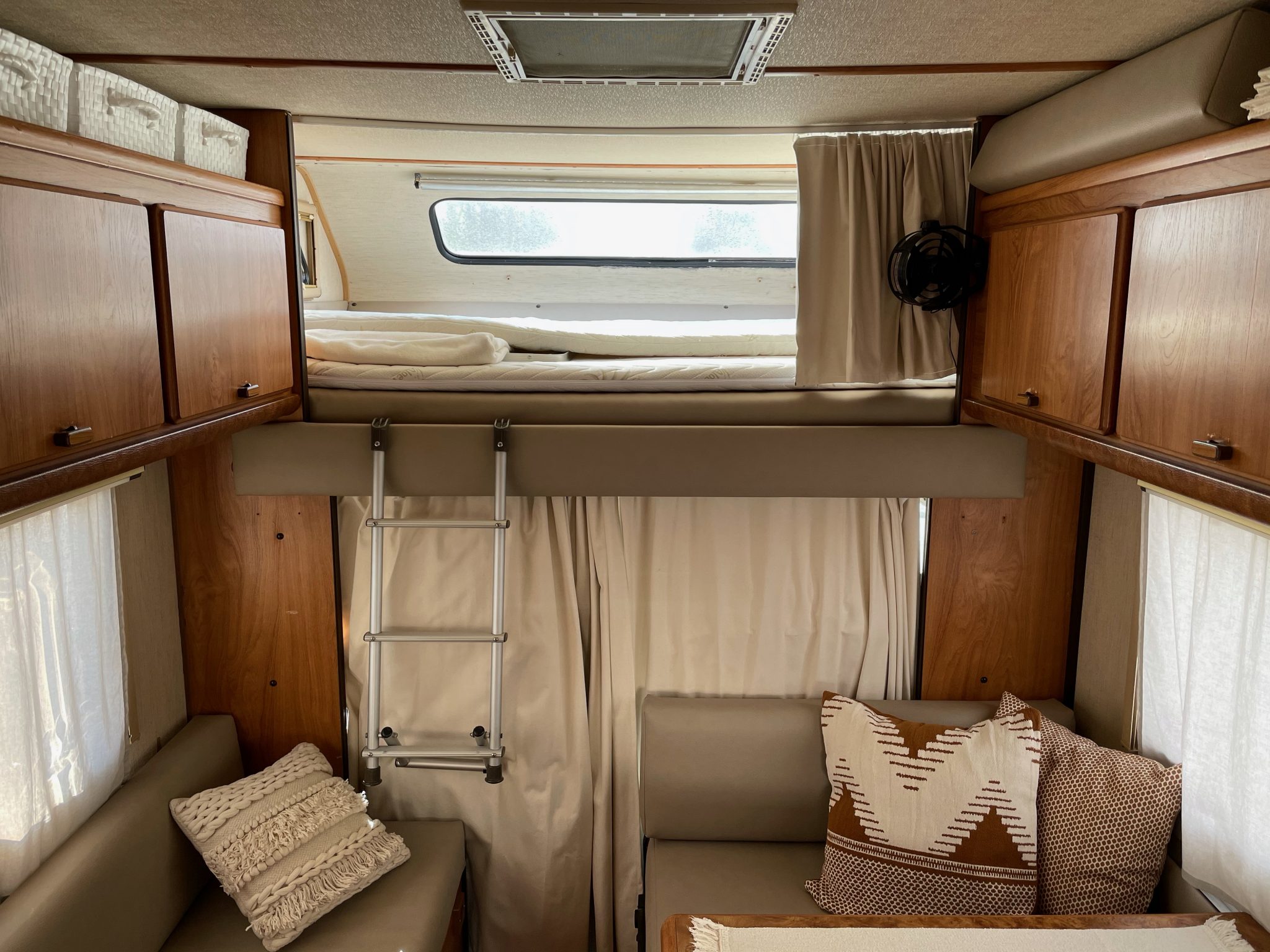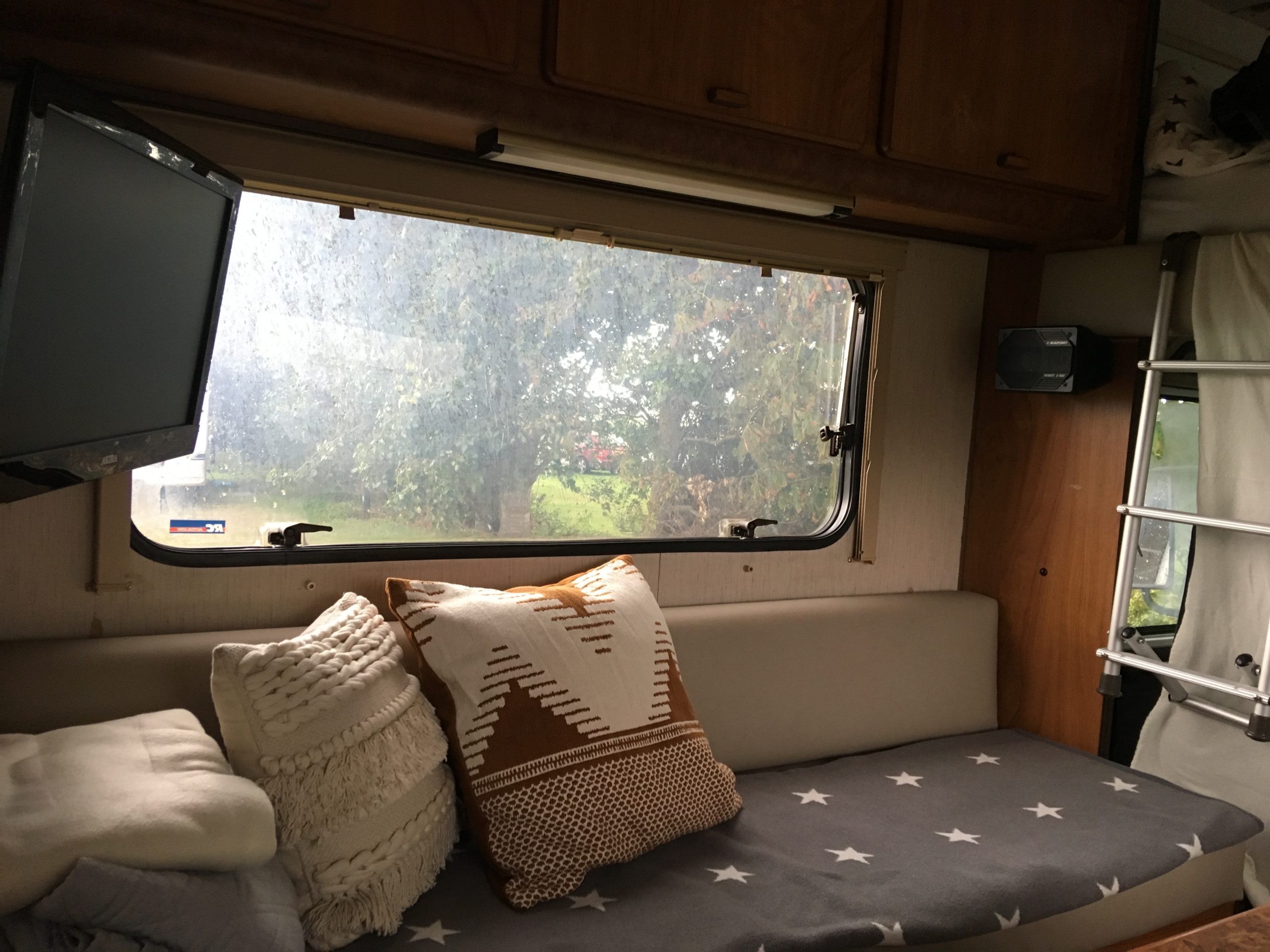Technisch wie optisch gab es ein paar kleine Upgrades: Der alte Fernseher wurde durch einen größeren Smart-TV ersetzt, was uns auch auf Reisen ein bisschen Streaming-Luxus erlaubt. Um im Winter oder in kühlen Nächten nicht das gesamte Fahrerhaus mitheizen zu müssen, kam ein dicker Thermovorhang zwischen Wohnraum und Cockpit hinzu – effektiv und gemütlich. Neue Vorhänge aus Baumwollstoff ergänzen das Ganze, sorgen für mehr Privatsphäre und bringen eine wohnliche Atmosphäre, die sich fast wie Zuhause anfühlt.