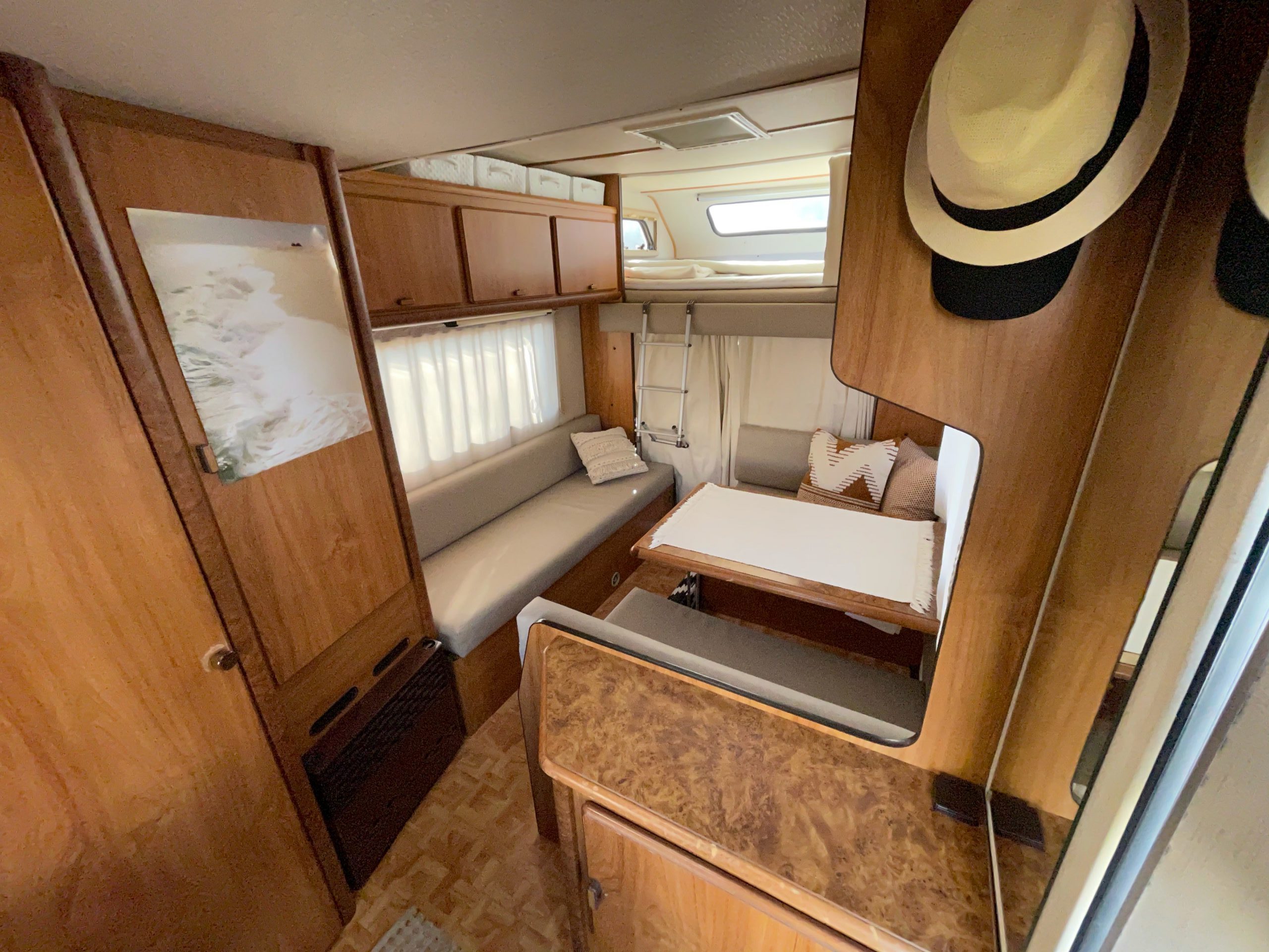 Schon beim ersten Betreten war klar: Innen steckt Potenzial. Der Vorbesitzer hatte bereits die Polster neu aufbereitet und mit beigem Kunstleder bezogen. Das war für uns ein Hauptargument, denn es verlieh dem Innenraum sofort ein gepflegtes, helles Ambiente – und war komplett geruchsfrei, was bei einem fast 30 Jahre alten Fahrzeug keine Selbstverständlichkeit ist. Die Sitze waren bequem, die Farbwahl stimmig, und das Kunstleder ließ sich leicht reinigen – ideal für unterwegs.